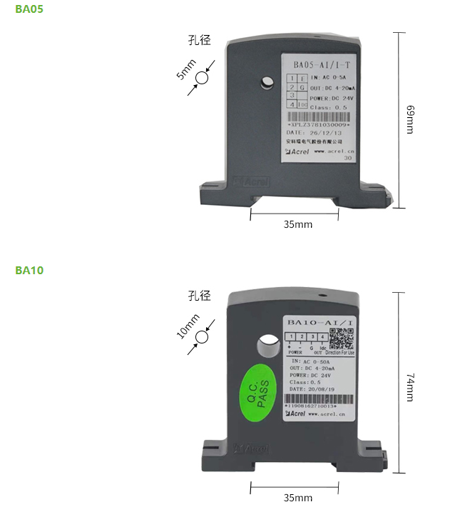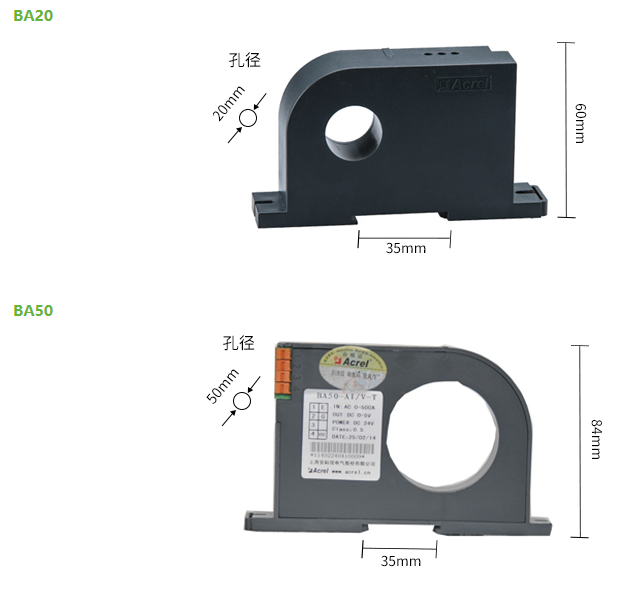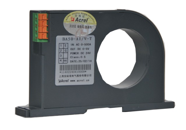智能型 BA 系列電流傳感器應用電磁感應原理,對電網中的交流電流進行實時測量,采用恒流和線性補償技術,將其隔離變換為標準的直流信號輸出,或通過 RS485 接口(Modbus-RTU 協議)將測量數據進行傳輸。DC24V 或 12V 安全電壓供電,可廣泛用于工業自動化領域。BA50L(Ⅱ)-AI 為交流剩余電流互感器,主要檢測用電系統的漏電流,能隨時掌握電氣線路和設備的情況,防止因漏電而發生的火災等事故。