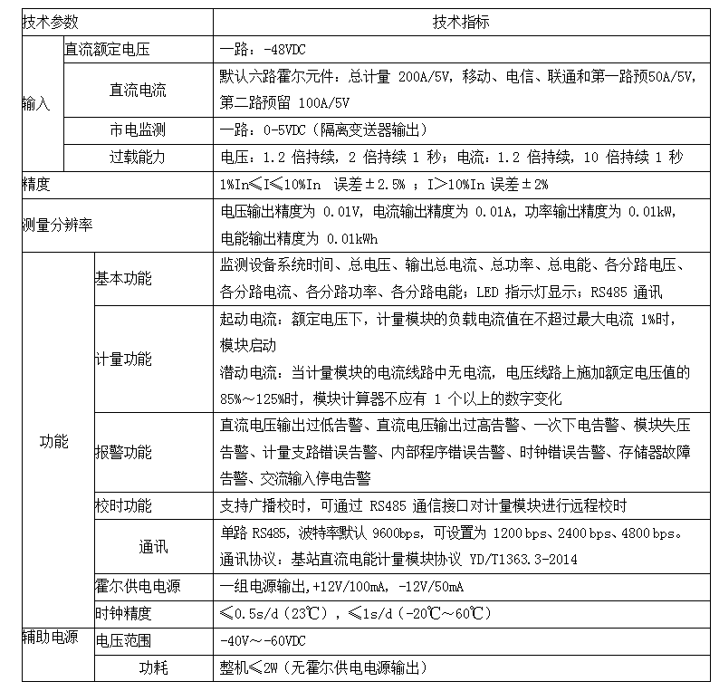 • AMC16-DETT 基站直流電能計量模塊主要是針對有共享需求,且開關電源無分用戶電量計量功能的基站而設計的。儀表可對六個回路的直流電能進行計量,并可為配套的霍爾傳感器提供工作電流,同時可通過上位機軟件實現零漂校準,具有遙測、遙信、遙調、實時電量計量、供電質量異常告警、信息存儲及處理、信息交互等功能。該模塊可分別計量三家運營商的直流用電量,為基站節能改善提供詳細的數據依據,為直流配電設備提供分項計量解決方案。模塊具有工業標準的 RS485 通訊接口,采用 YD/T1363.3-2014 規定的通訊協議,符合中國鐵塔有限公司Q/ZTT 2205-2017《基站直流電能計量模塊技術要求》相關技術要求。