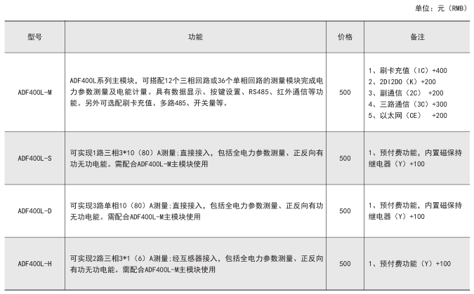 ADF400L系列多用戶電能表,通過模塊組合的方式最大可實現12路三相或36路單相的直接接入測量或12路三相互感器接入測量、直接接入和互感器接入的混合測量方式,該系列電能表因準確度高、集中安裝、集中管理、安裝靈活性高,互不干擾等優勢深受小區、學校、企業等的青睞。該系列儀表支持預付費功功能。